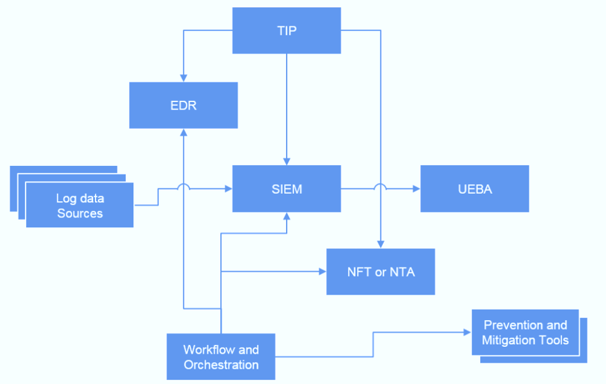 检测:威胁检测是透过SIEM的规则引擎(构建的威胁检测模型)进行的,该引擎实时检测威胁,并将其与威胁情报平台(TIP)关联起来,以提高警报准确性。